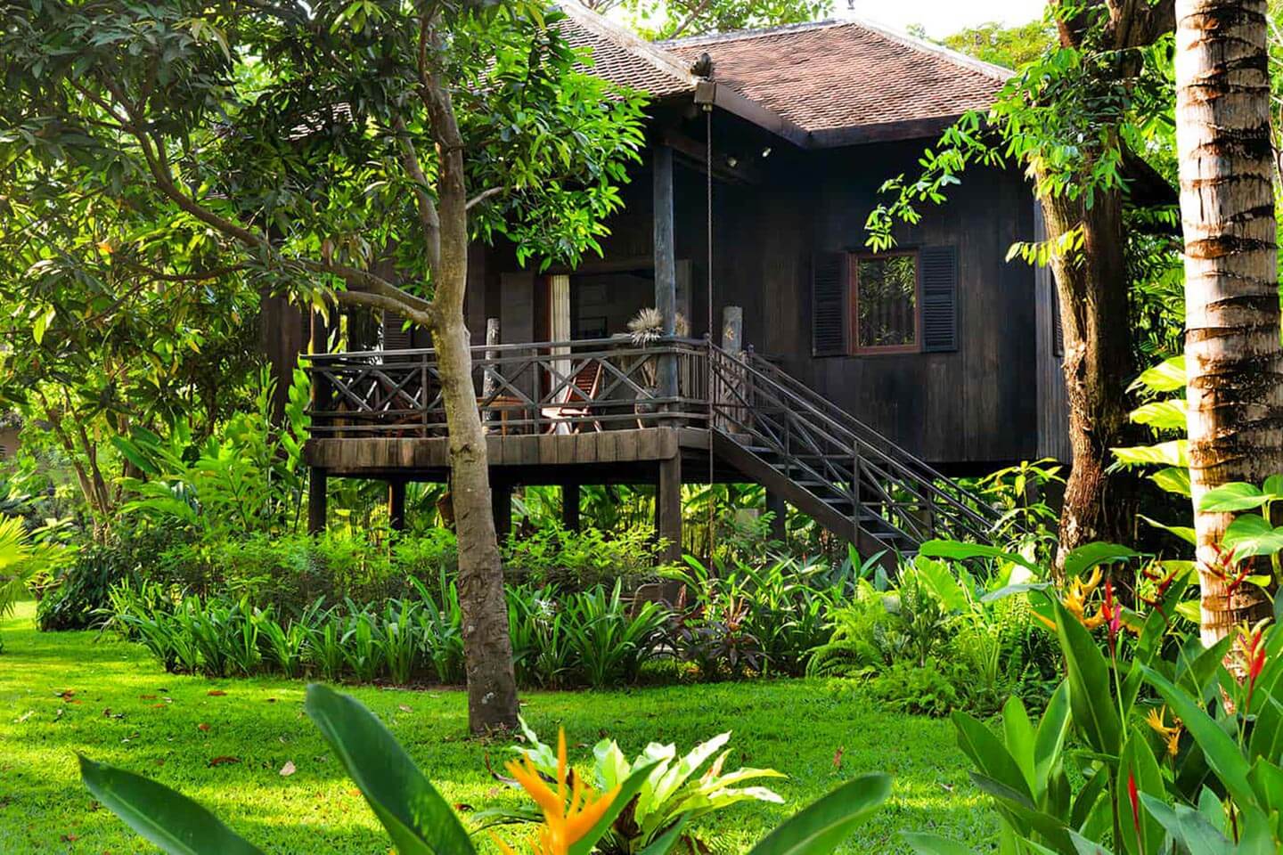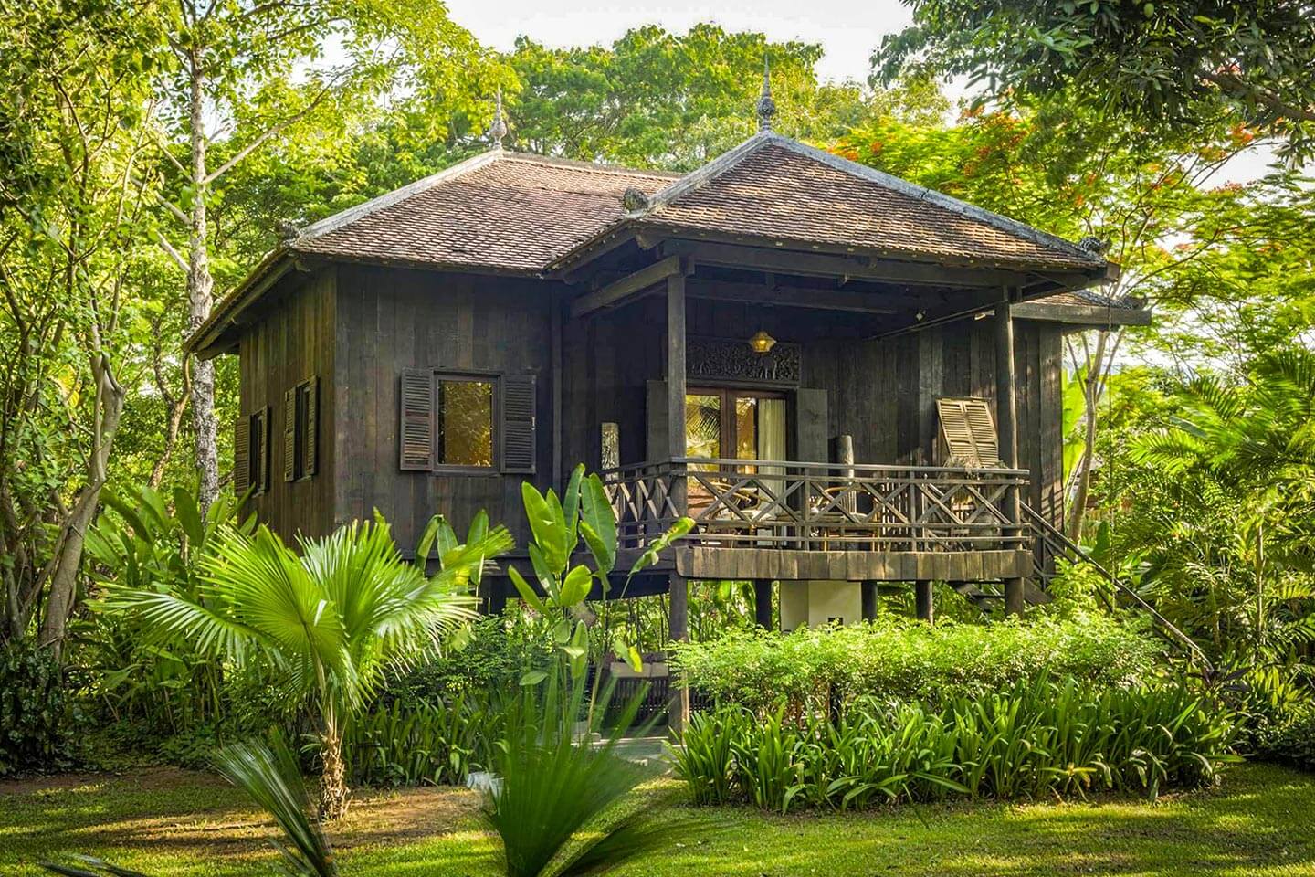 Das Khmer-Haus ist ein offener Bau aus den 1940er Jahren. Es wurde an seinem ursprünglichen Standort, kilometerweit vom heutigen Grundstück entfernt, vor der Zerstörung bewahrt, sorgfältig abgebaut und originalgetreu restauriert. Als traditionelles kambodschanisches Holzhaus auf Stelzen verfügt es über einen offenen Wohnbereich im Erdgeschoss und einen großen, klimatisierten Schlafbereich mit modernem Badezimmer im Obergeschoss.