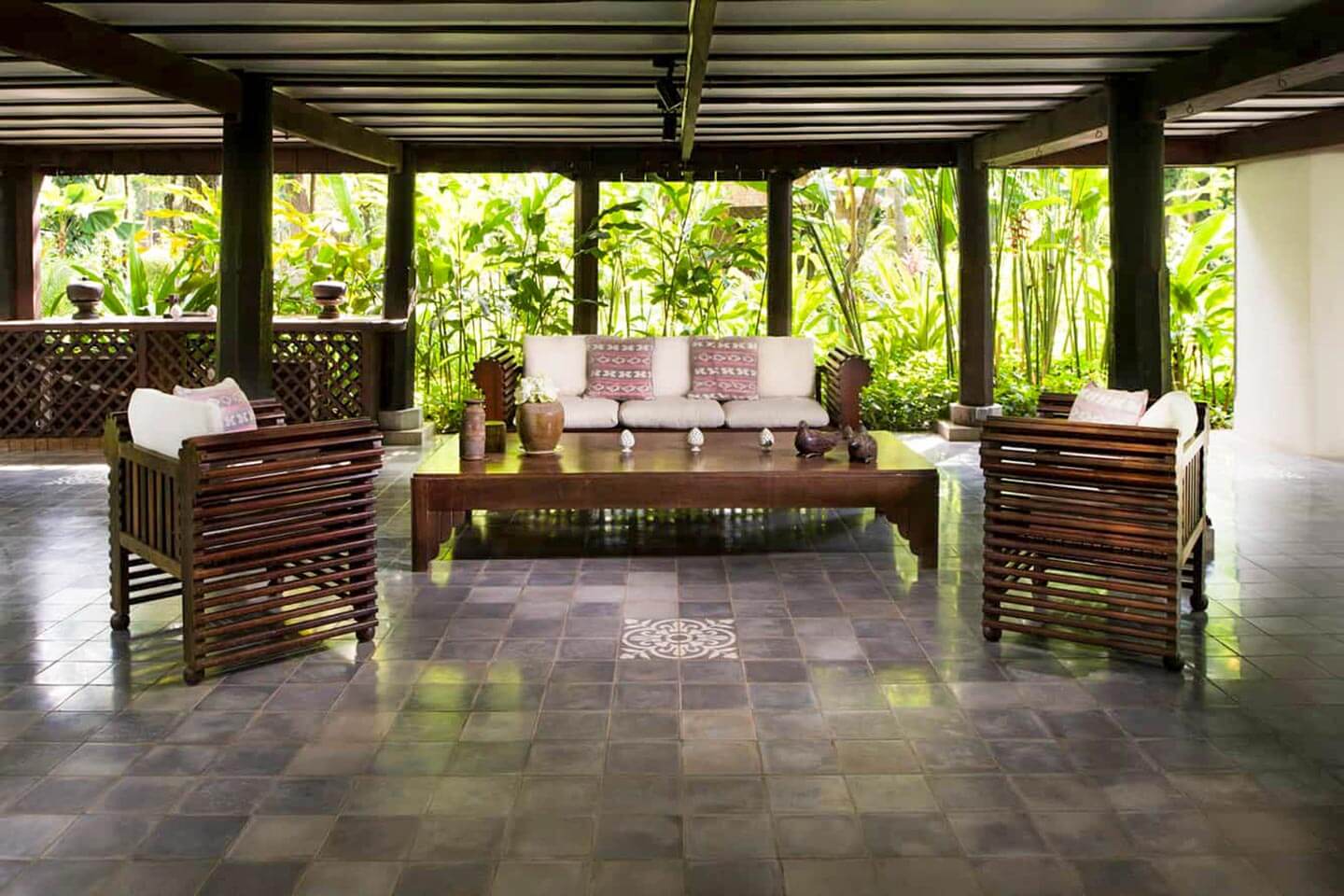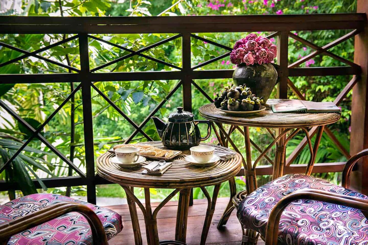 Die antiken Möbelstücke sind die edelsten Stücke des gesamten Anwesens: Ein Kinderbett aus den 1930er-Jahren, das zu einem Sofa umfunktioniert wurde, die dreibeinigen Mahagoni-Sessel und der markante Art-déco-Tisch zeugen auf wertvolle Weise von der Handwerkskunst kambodschanischer Holzwerkstätten der 1930er-Jahre. Es ist ein intimes Paradies für Paare, bietet aber mit zusätzlichen Betten auch Platz für eine junge Familie.