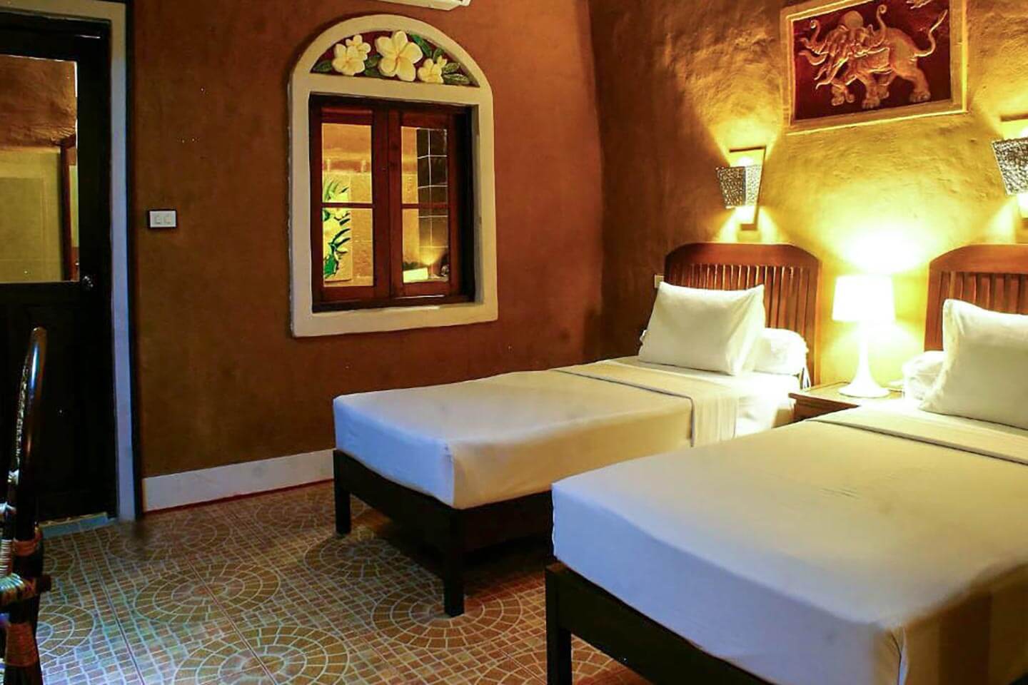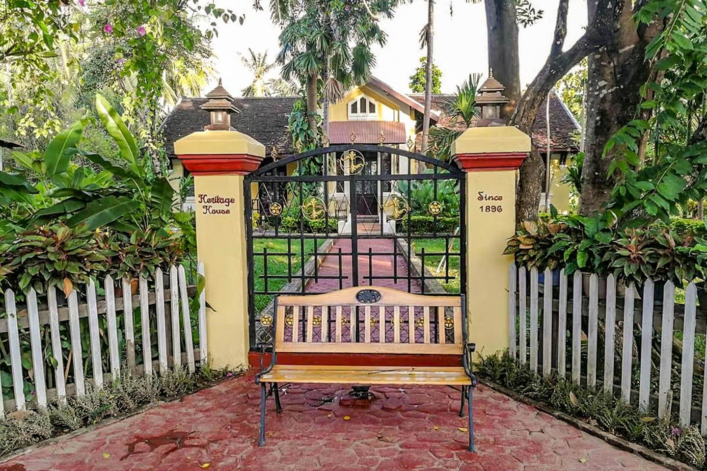 Drei laotische Bungalows, erbaut 1995 im Stil der laotischen Kolonialarchitektur, bestechen durch ihre Doppeldächer aus Ferrakotta-Ziegeln und Holzschindeln, die Holzwände und die Stelzen aus Holzpfosten und gemauerten Säulen. Die in den leuchtenden Farben der Region gestrichenen Gitterwände verleihen dem Haus ein exotisches Flair. Jedes Zimmer ist geräumig und verfügt über ein eigenes Bad und einen Balkon. Gekalkte Wände, Bambusdecken, Holzböden und Rattansessel sorgen für Komfort und ein behagliches, koloniales Ambiente.