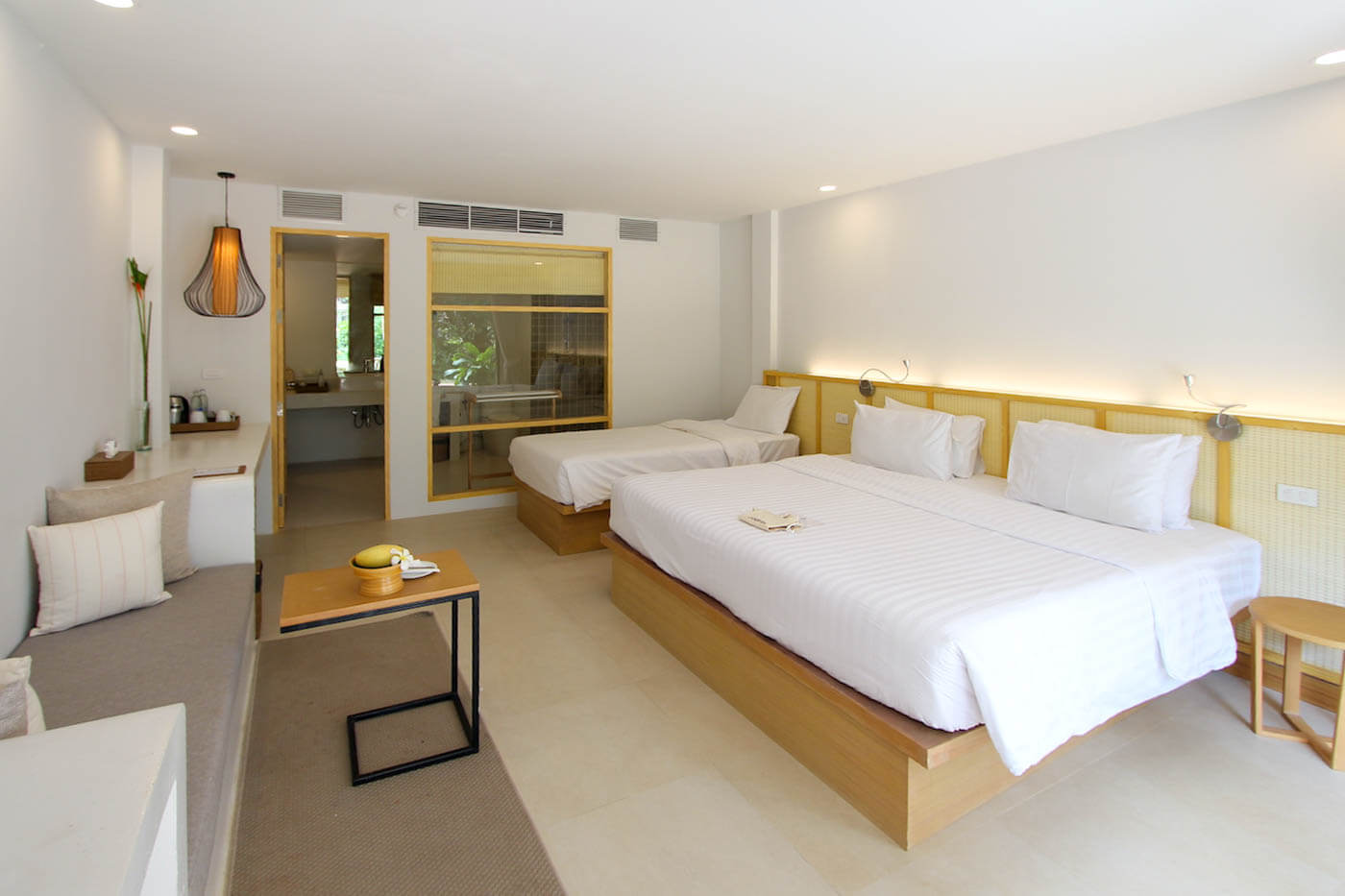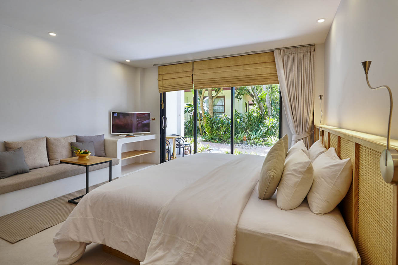 Eingebettet in die tropische Gartenlandschaft der Anlage und nur wenige Schritte vom Strand entfernt, befinden sich die Garden View Villen. Diese sehr beliebte Zimmerkategorie ist aus Holz im modernen Thai-Stil erbaut und bietet auf 40 Quadratmetern viel Platz, inklusive einer großzügigen Veranda mit Tagesbett. Ein Aufenthalt in diesem Zimmer sorgt sofort für ein Gefühl von Zuhause auf Koh Samui und in Thailand.