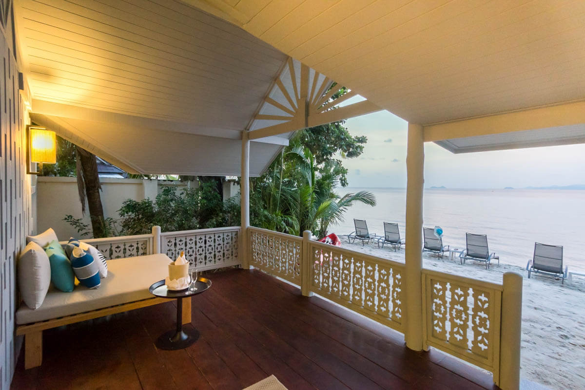 Eingebettet in die tropische Gartenlandschaft der Anlage und direkt am Strand gelegen, gehören die Beachfront Villen zu den begehrtesten Zimmern. Sie wurden im modernen Thai-Stil erbaut und bieten auf 42 Quadratmetern eine großzügige Veranda mit Tagesbett. Zusätzlich steht eine eigene Strandfläche direkt vor der Villa zur Verfügung, die noch mehr Privatsphäre ermöglicht.