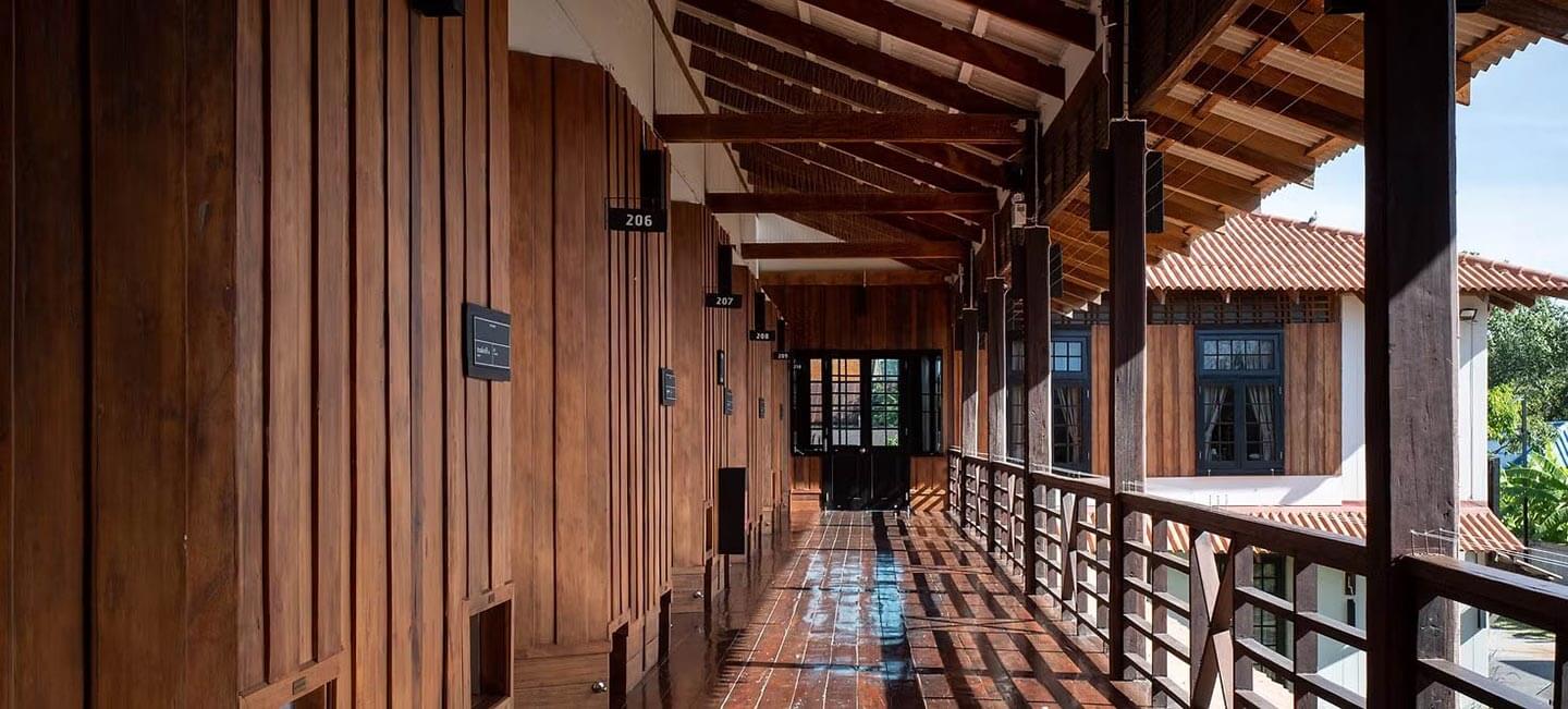 UTHAIHERITAGE ist eine Hommage an sein 70 Jahre altes Schulgebäude, dessen hölzerne Balken nun im Kontrast zu thailändischer Volkskunst und -gestaltung stehen.